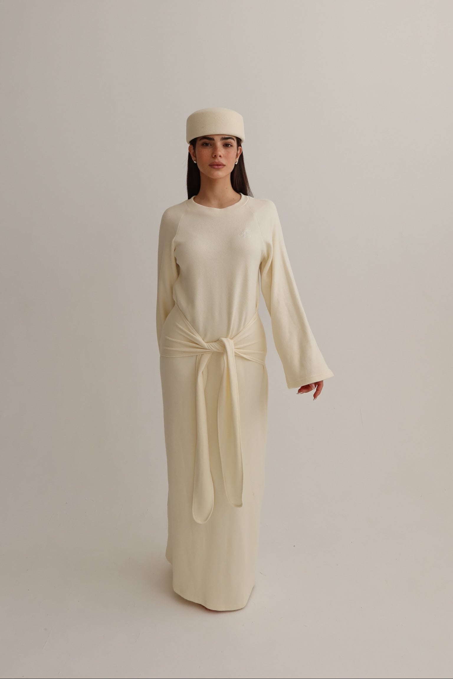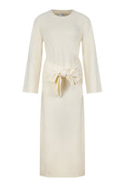 שמלת חורף מלטפת עם קשירת מותן ושרוולי פעמון.