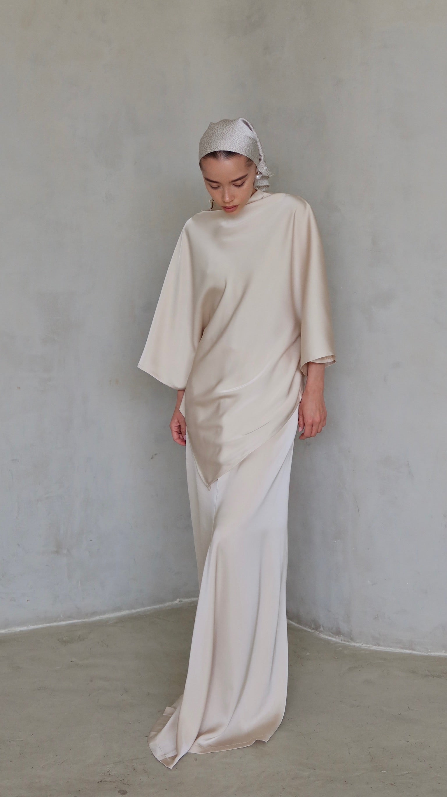 חולצה בצורת ״משולש״ עם כיפתור יוקרתי בצווארון וחצאית בגזרה גבוהה ומחמיאה שהולכת ומתרחבת מאיזור האגן ומטה.