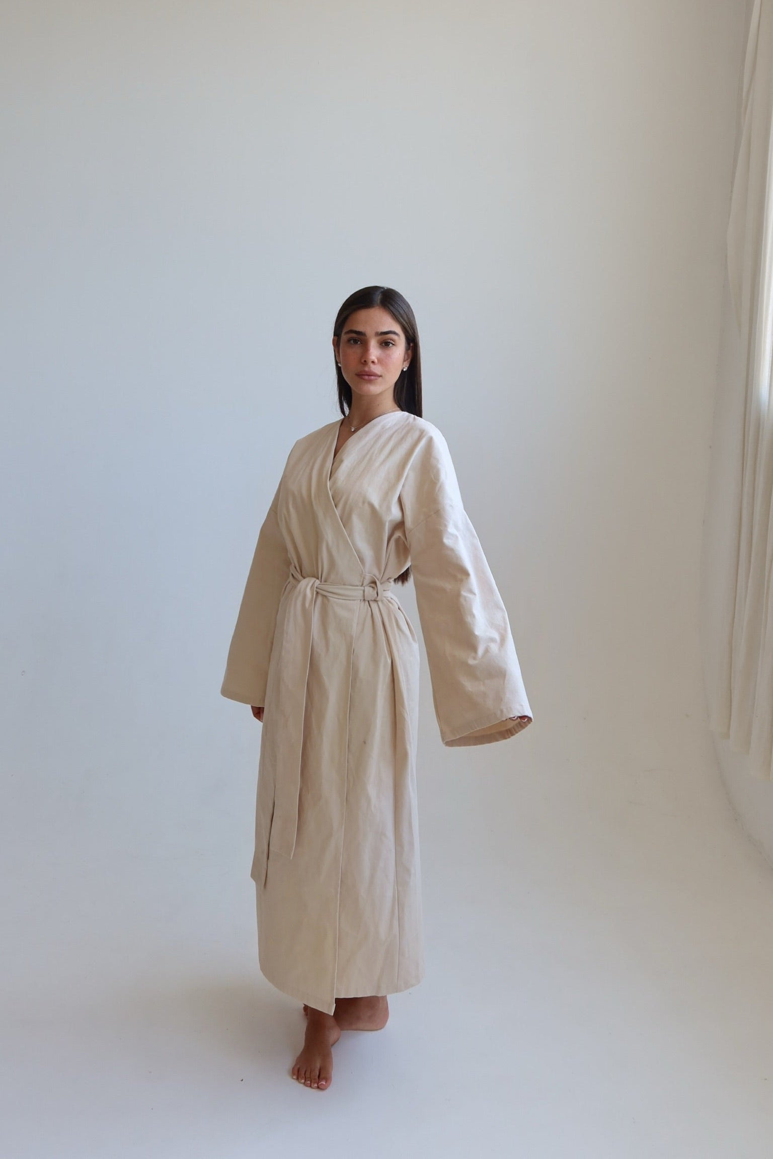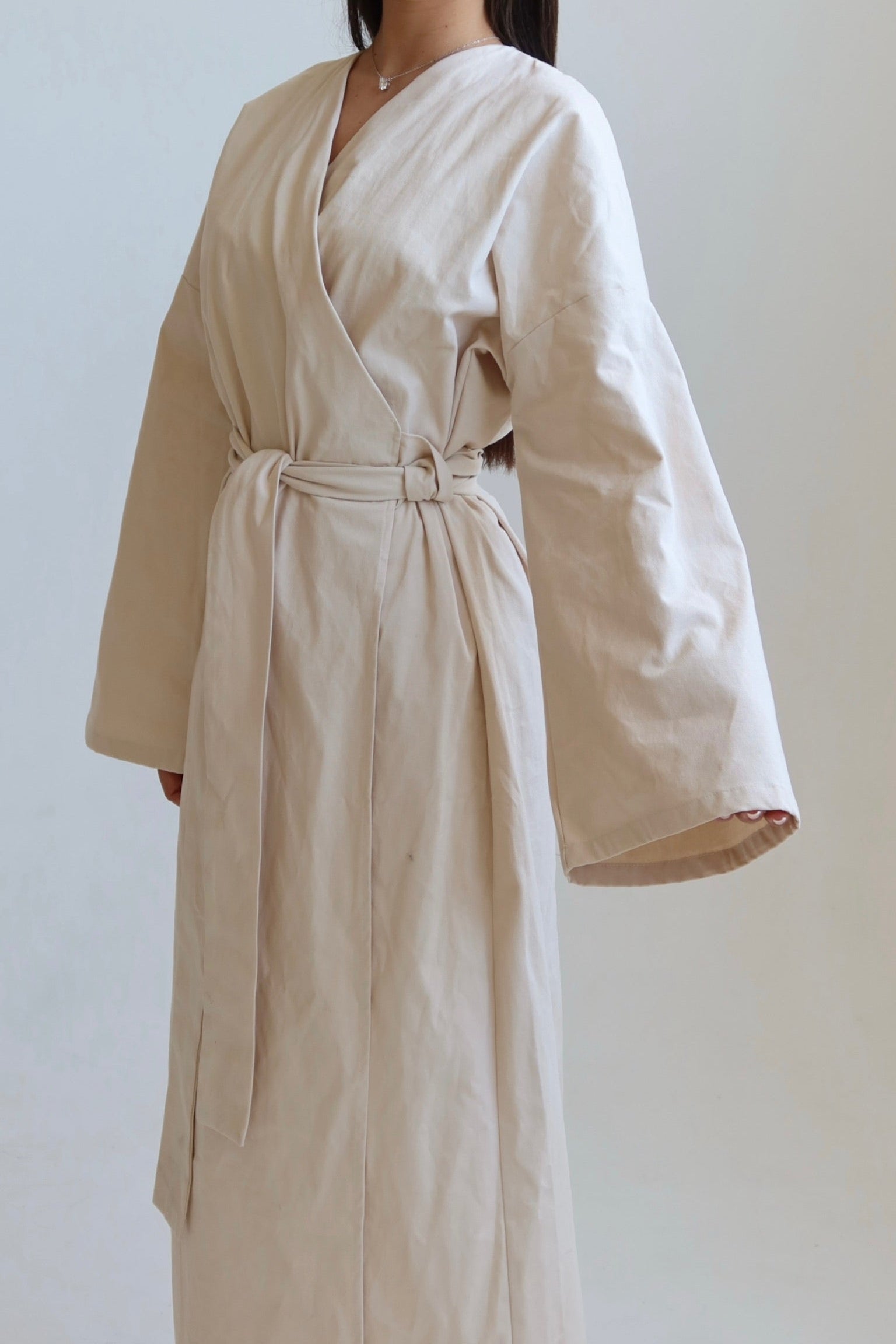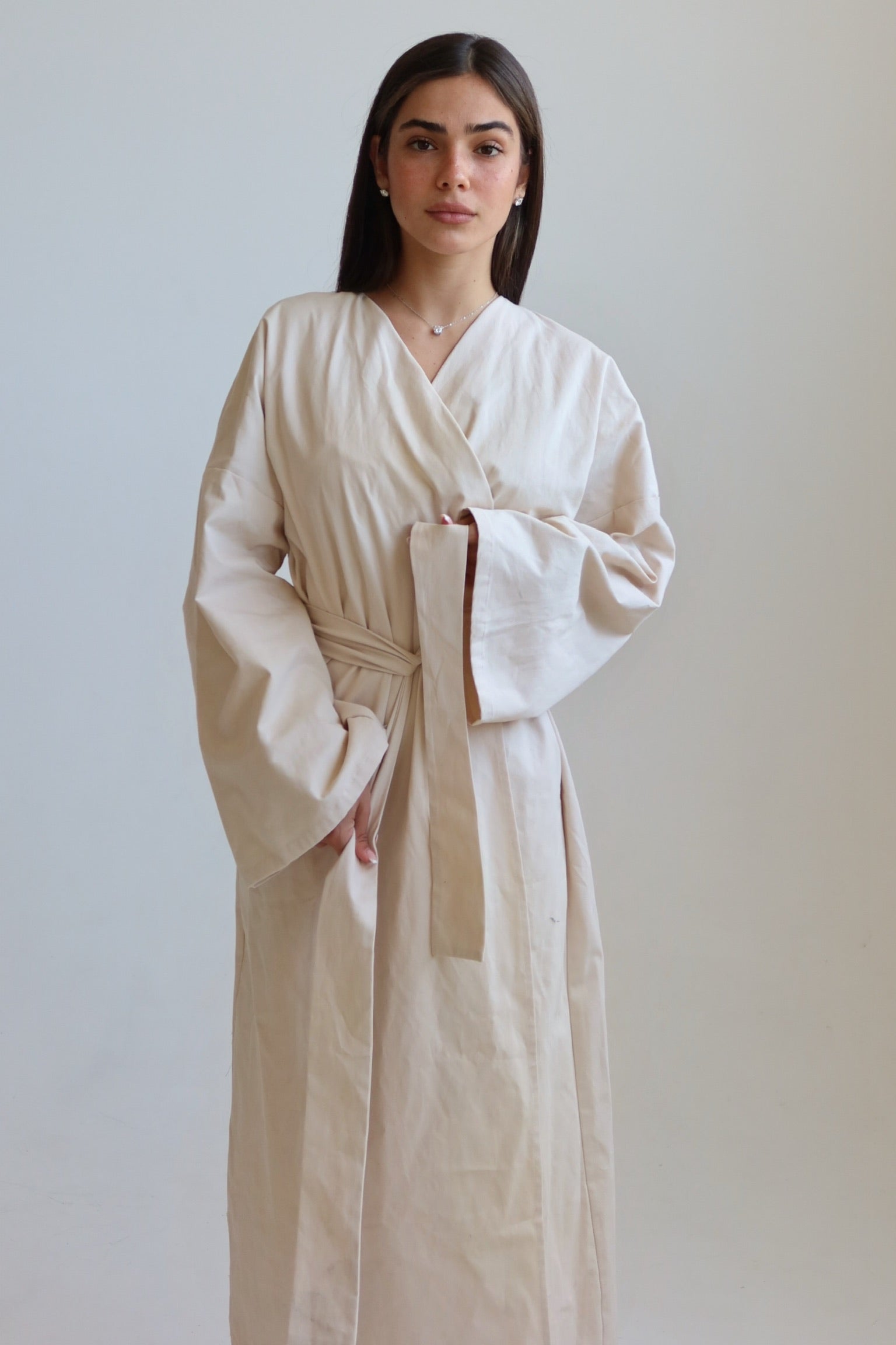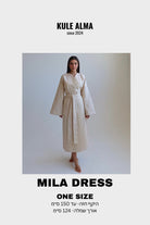 דרופ מילה דרופ נקי בהשרת הסתיו והפריחה. שמלה מבד דמוי פשתן בגזרת קימונו באורך מיד,