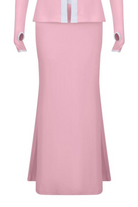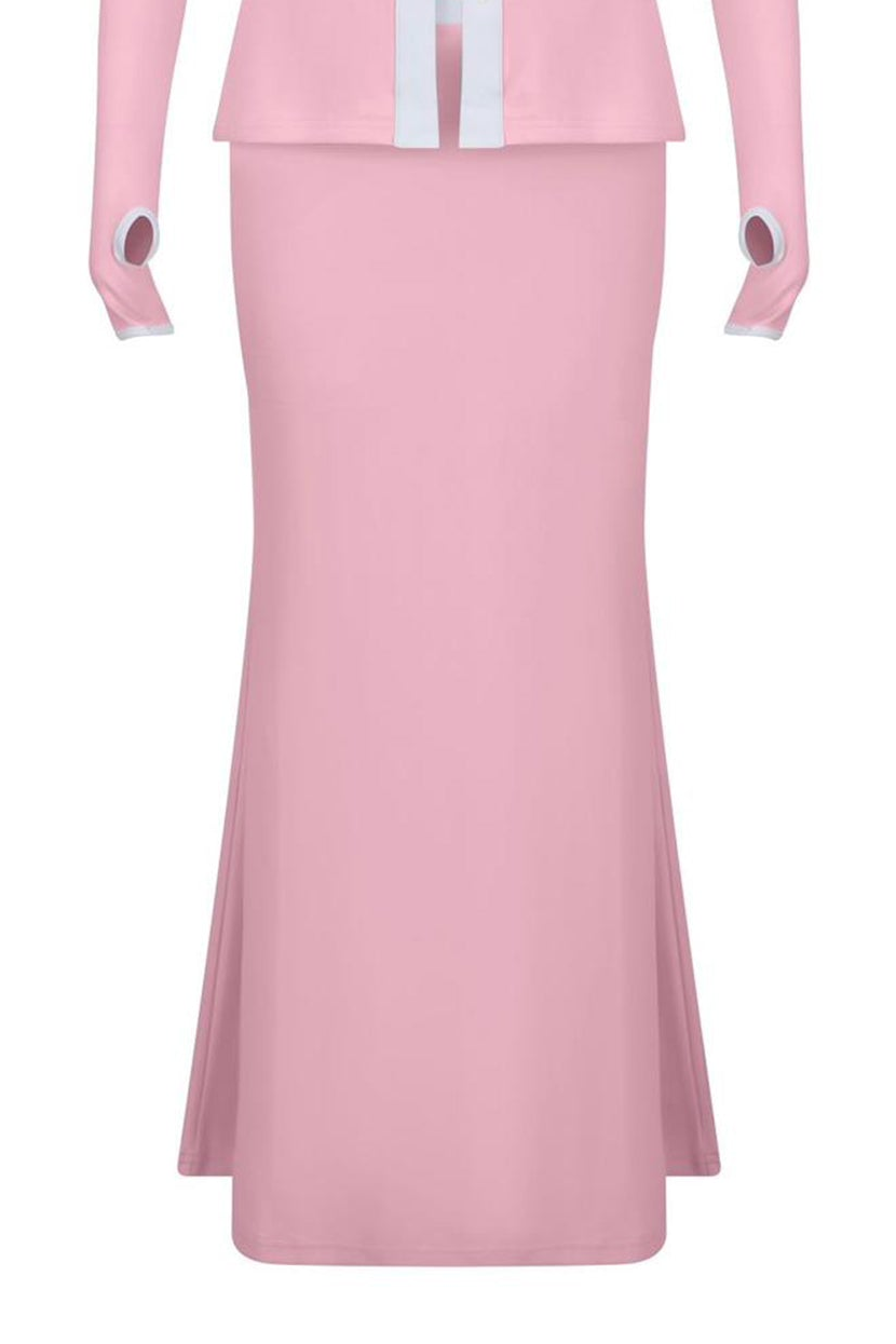 חצאית יום יום ממותגת,עם כריות דומיננטיות בכתפיים,שרוול כפפה,בתוך חצאית אסתי ישנה תחתית של חצאית מחטבת.