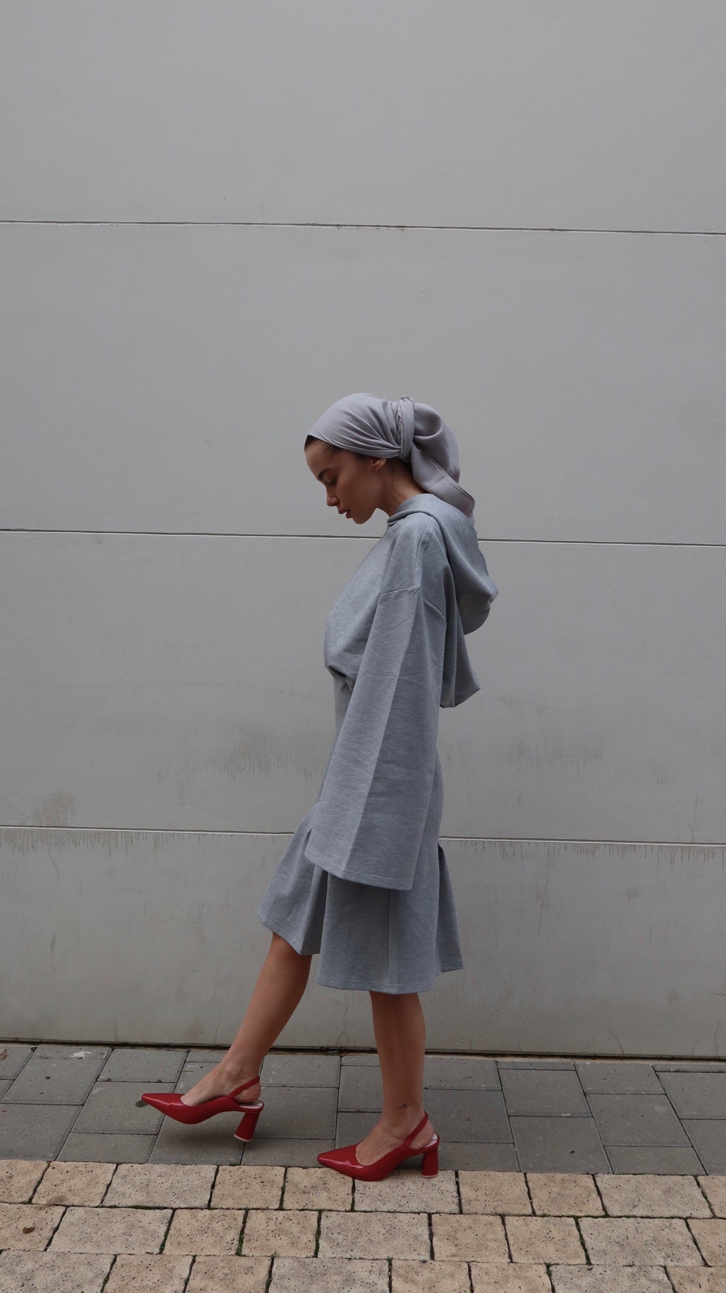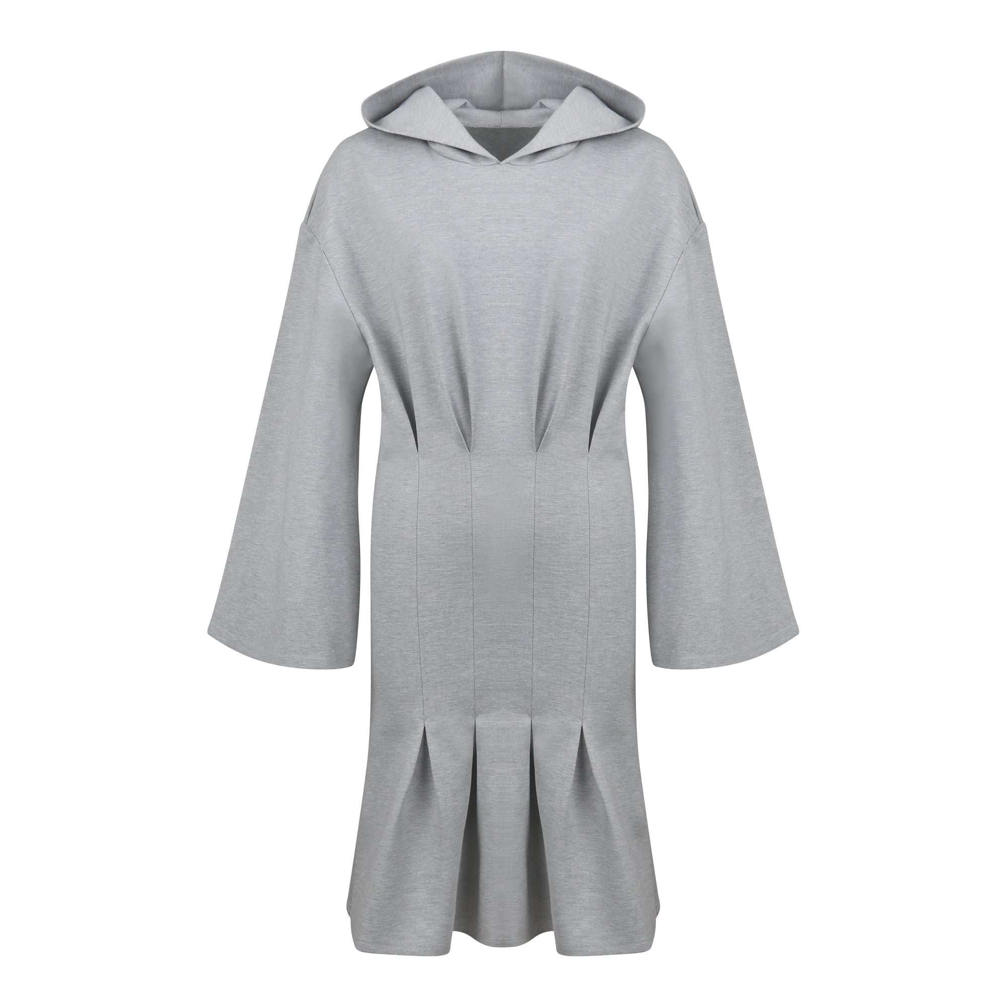 שמלת קפוצ׳ון ושרוולי פעמון,עם כיווצים מחמיאים לאורך כל הבטן והמותן ולסיומת חצאית מלמלה שניתן לשלוט באורך שלה.