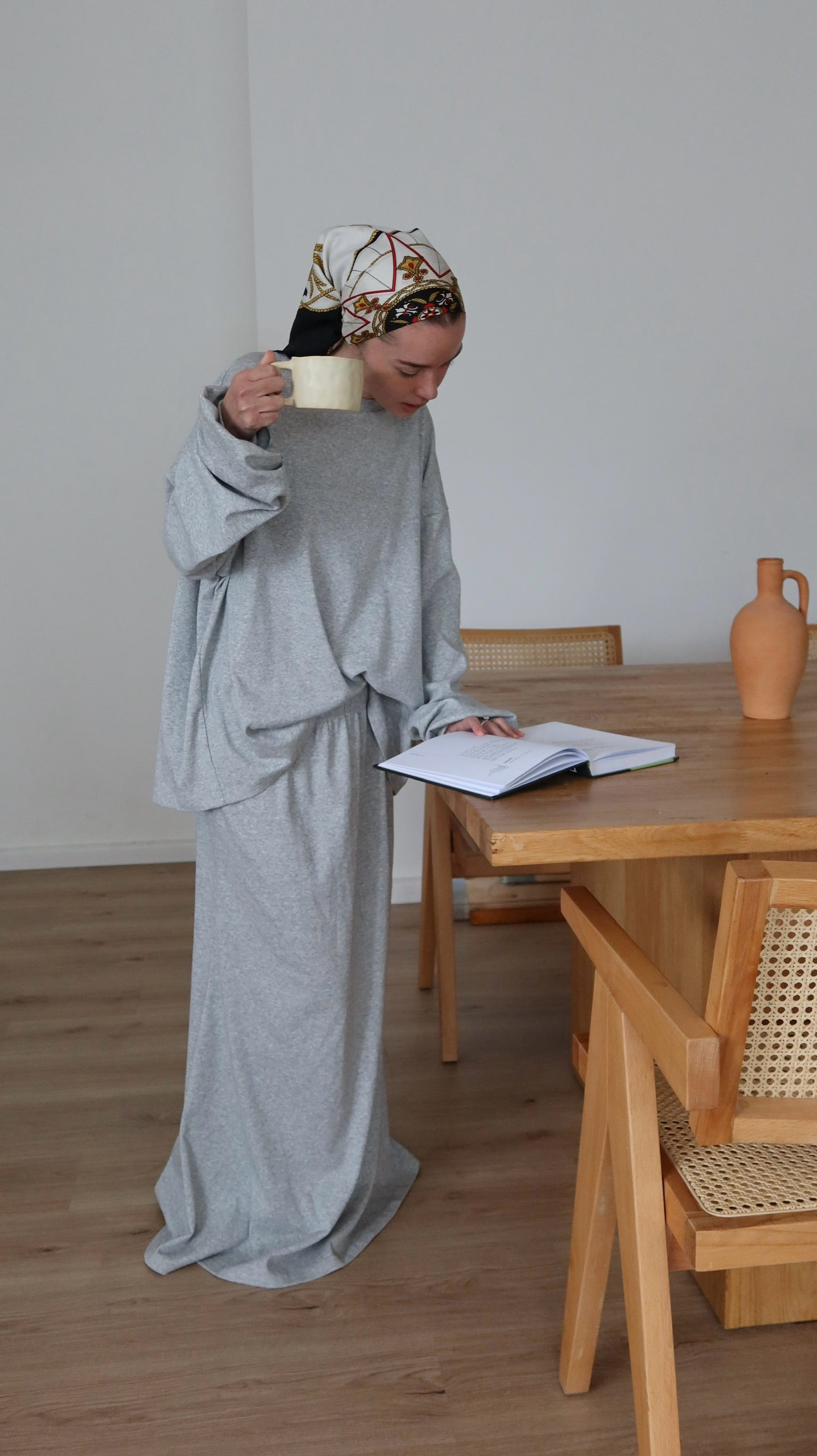 החולצה אוברסייז עם שרוולים גדולים ומלאים בסטייל, החצאית מגיעה עם גומי במותן מה שמאפשר שליטה על אורך החצאית.