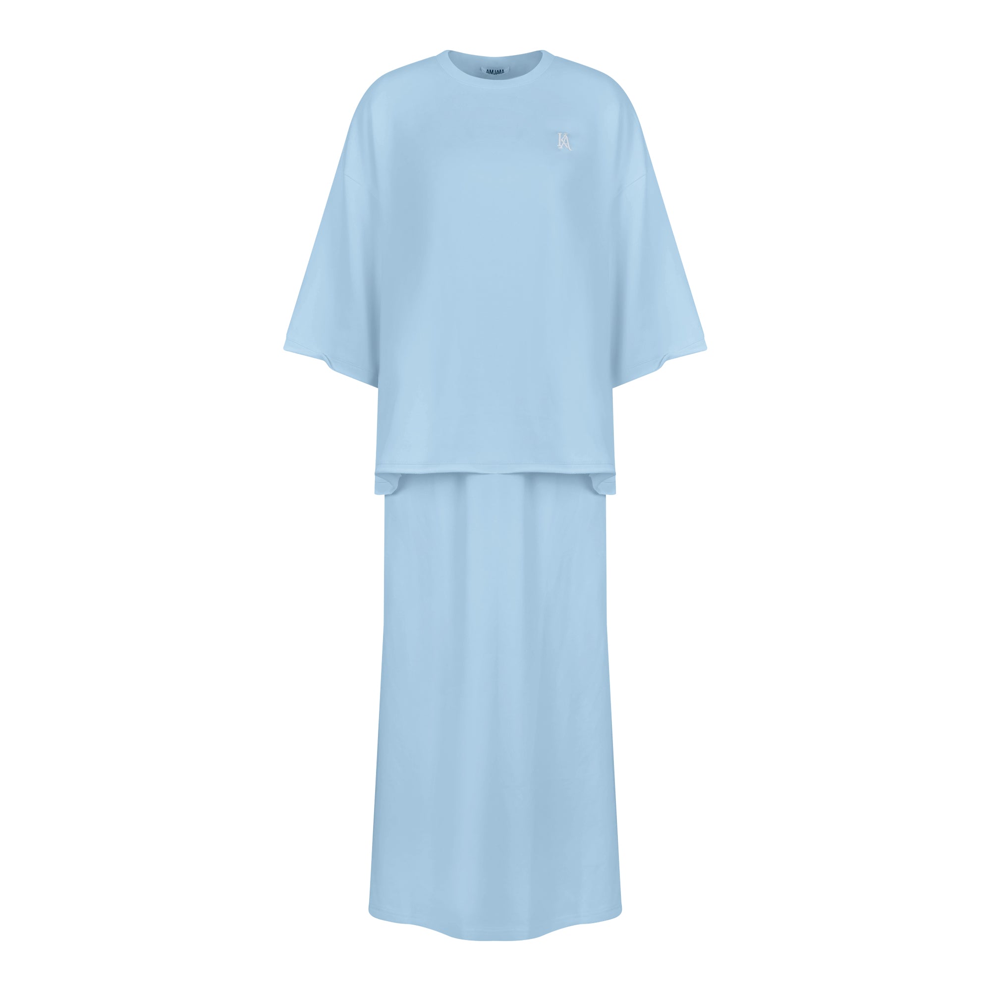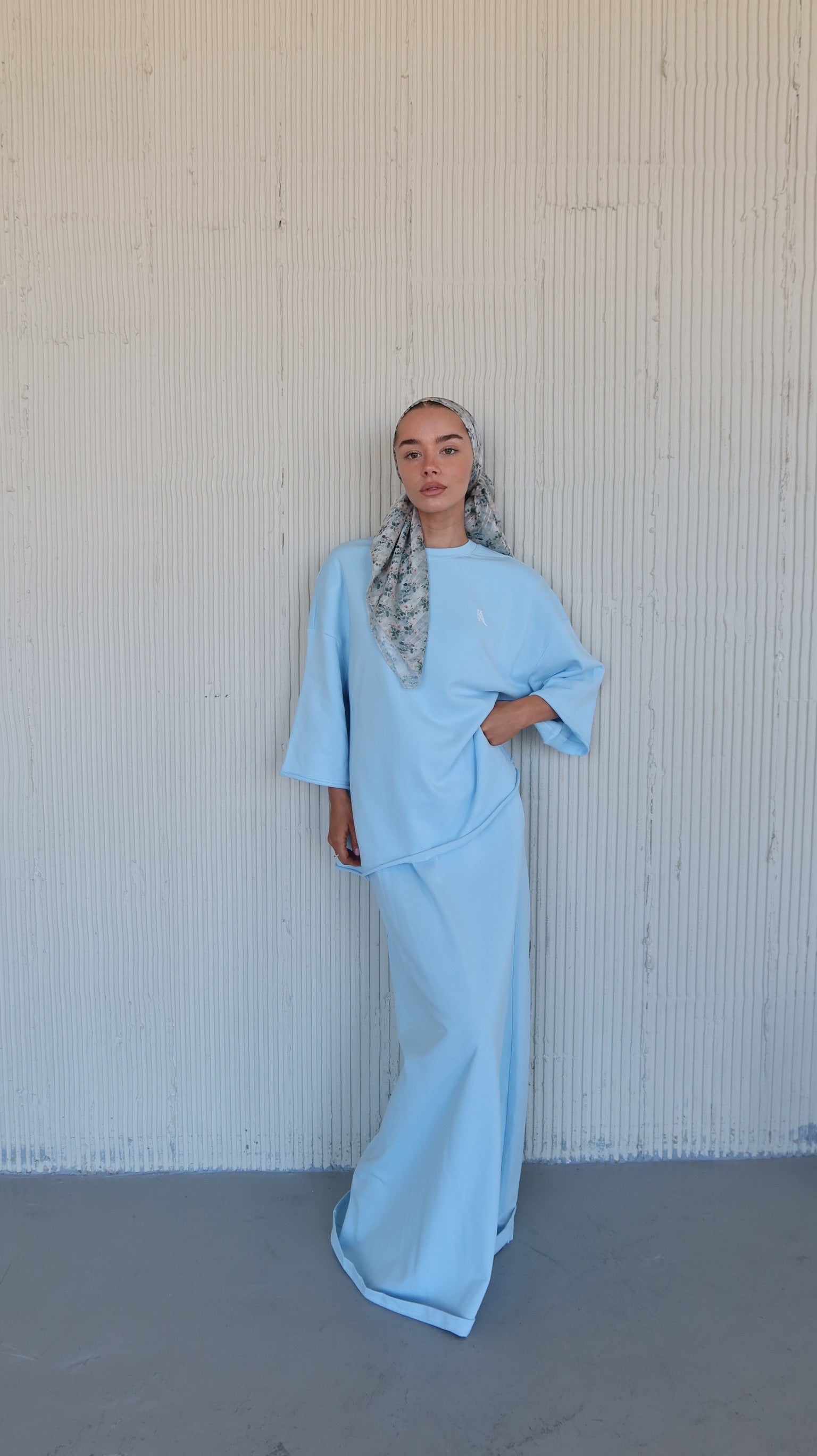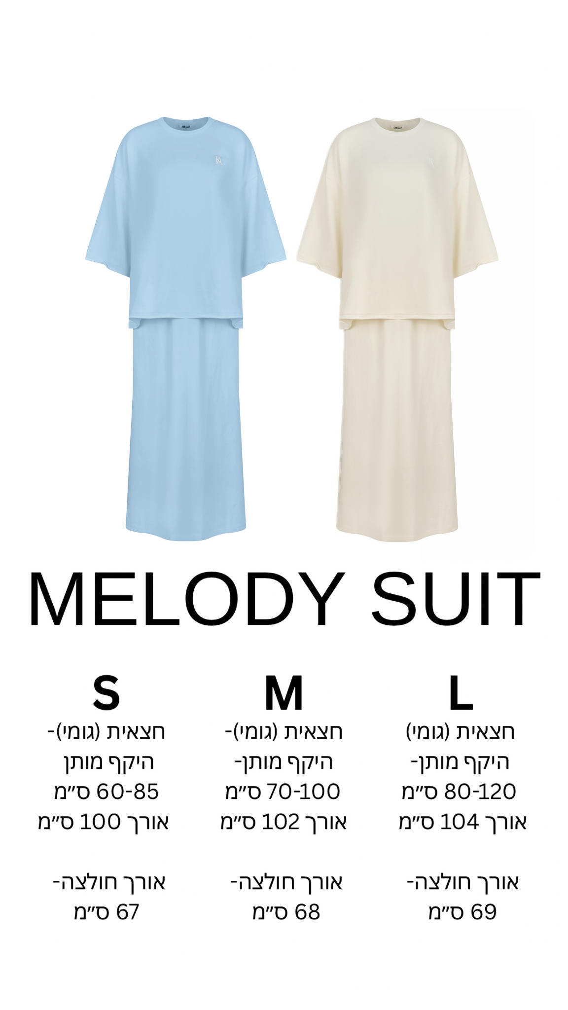 חליפת בייסיק מבד פראנץ׳ טרי איכותי, טישרט מוקפדת עם כריות בכתפיים שיתן לה טוויסט אלגנטי, לוגו של כולי עלמא, חצאית ארוכה ונשפכת עם הצרה במותן ופתיחה מהאגן ומטה.