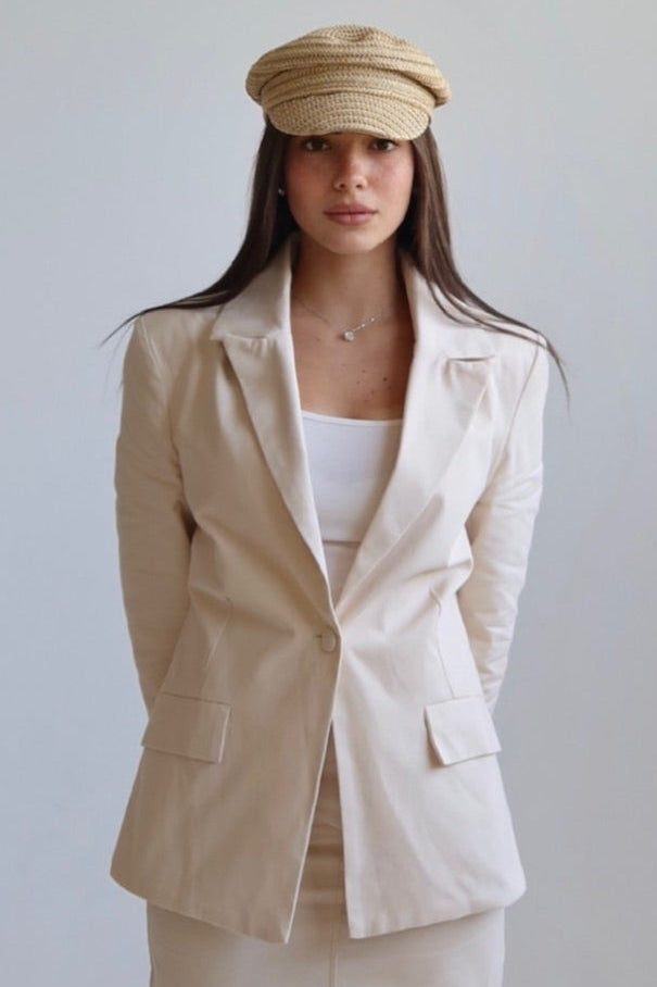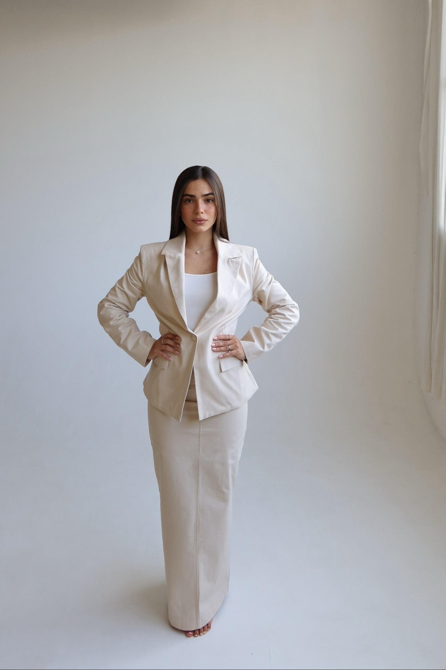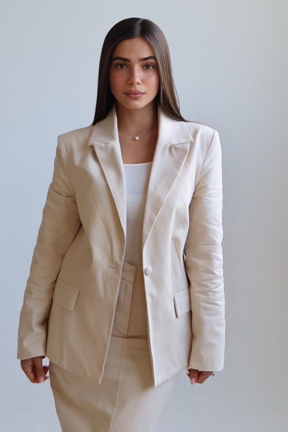 חליפה מבד דמוי פשתן עם בלייזר בעל כריות כתפיים למראה מורם ואלגנטי והצרה מחמיאה במותן,