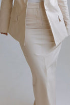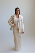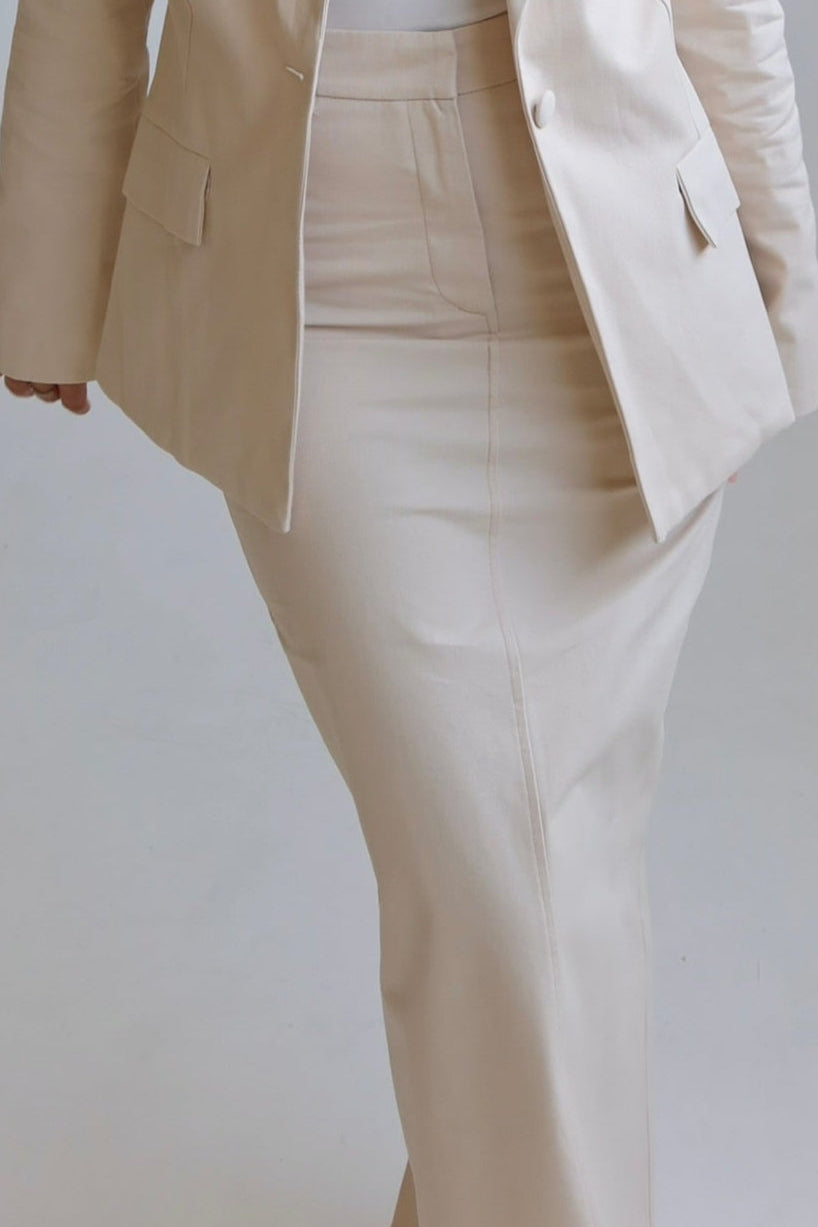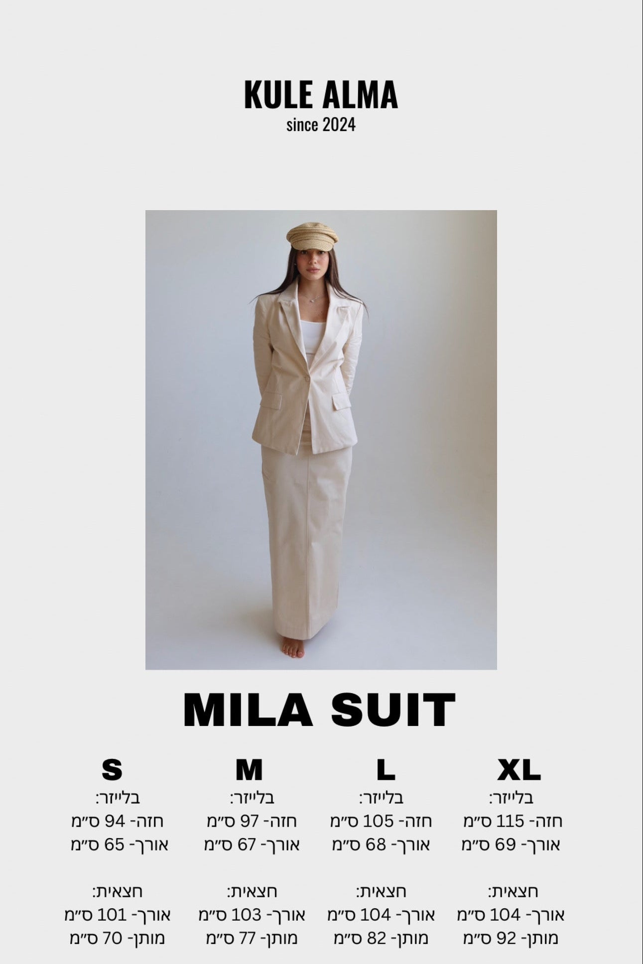 חליפה מבד דמוי פשתן עם בלייזר בעל כריות כתפיים למראה מורם ואלגנטי והצרה מחמיאה במותן,
