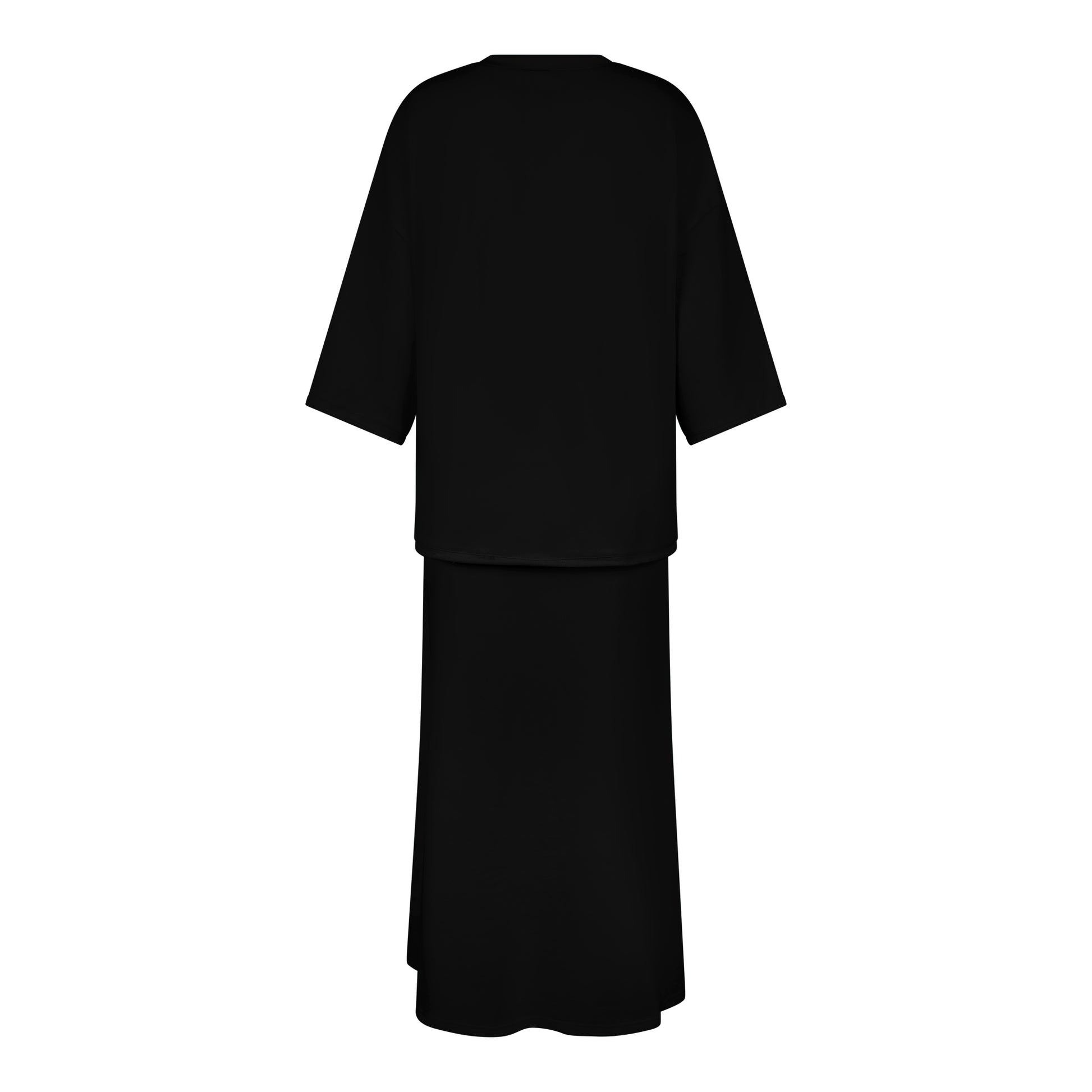 חליפת בייסיק מבד פראנץ׳ טרי איכותי, טישרט מוקפדת עם כריות בכתפיים שיתן לה טוויסט אלגנטי, לוגו של כולי עלמא, חצאית ארוכה ונשפכת עם הצרה במותן ופתיחה מהאגן ומטה.